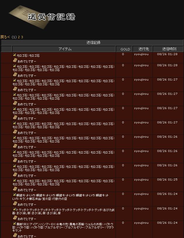喉はだいぶマシかな。 ハイライトメンソール効果? ───────────────────────────── 第4回「釣果2500匹目を当てろ!」 結果発表ダスー。 まぁ当日は釣りチャットが落ちたり、正次郎さんがゲフゲフだったりと 色々波乱万丈でしたが何とか無事終りました。 皆様、ありがとうございました。 で、まずはいつもの様に装備品ね。 で、いざ釣ろうとしたら・・・ Σ(`Д´)ちょ!? ま、当然スキル1で釣れる訳も無く当然プッチン(´ー`)y-~ リロって再開。 ドッコ強すぎ・・・orz しかもスキルアップて・・・(;´Д`) ま、そんな事はさておき。 ・eden_0106さん(シノビウオ) ・jimiさん(ドッコ) ・syoujirouさん(ドッコ) ・Hidderさん(ギッチョ) ・maniさん(キラント) jimiさんsyoujirouさんおめでとうございます!(^▽^) で、お二人は何とか(?)場外釣券者では無いので豆チャットにてじゃんけん。 結果はsyoujirouさん勝利!以下商品! ウヒヒwwwwwwwモロゴ石110個wwwwww(`▽´)y-~ 参加された皆様、お忙しい中ありがとうございました。 本当に皆様の持寄商品には頭が下がります(-_-)アリガトデスー また宜しくお願いしますです(´ー`)ノシ 次回は釣果3000かな(´ー`)y-~ ・・・いや、色々溜め込んで4000で実施も悪くないな( ´)y-~ ───────────────────────────── コメント返し。 何故かこの風邪、ハラを壊しますよね・・・ 何でだ?咳は全然出ねぇし。(;-_-)むぅ まぁ私は転職する予定だったので、このレンジャーのステ振りは適当なのですw とにかく自動回復を上回って良かったです。 ヘタすりゃ倒せないなんて事も(((´Д`))) 今日のイベは乙でした! 何か商品ばっかり送って貰って申し訳無いです(;-_-) 心得の商品も沢山頂いてしまって・・・ 次回こそはいい加減ドッコ以外を釣らないと暴動が起こりそう(;´Д`) PR